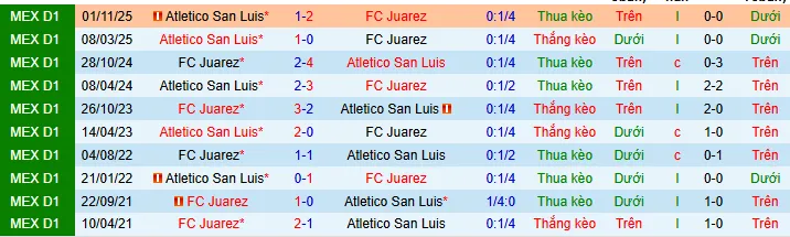 Lịch sử đối đầu giữa Juarez và Atletico San Luis
