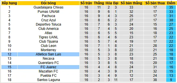 FC Juarez hiện đang đứng vị trí thứ 15 trên bảng xếp hạng với tổng cộng 16 điểm sau 16 trận đấu, kém 6 điểm so với Top 8. Thành tích của họ bao gồm 4 chiến thắng, 4 trận hòa và 8 trận thua, ghi được 24 bàn và để thủng lưới 31 bàn. Trong những trận đấu gần đây, FC Juarez gặp khó khăn trong việc lấy lại phong độ, khi không có chiến thắng nào trong 5 trận gần nhất, với 2 trận hòa và 3 trận thua. Trận thua mới nhất của họ là thất bại 2-4 trước Pumas UNAM, chính thức khép lại cơ hội đi tiếp. Mặc dù gặp khó khăn trong thời gian qua, đội bóng đã thể hiện những dấu hiệu tích cực, đặc biệt trong lối chơi tấn công với 24 bàn thắng ghi được trong mùa giải này.