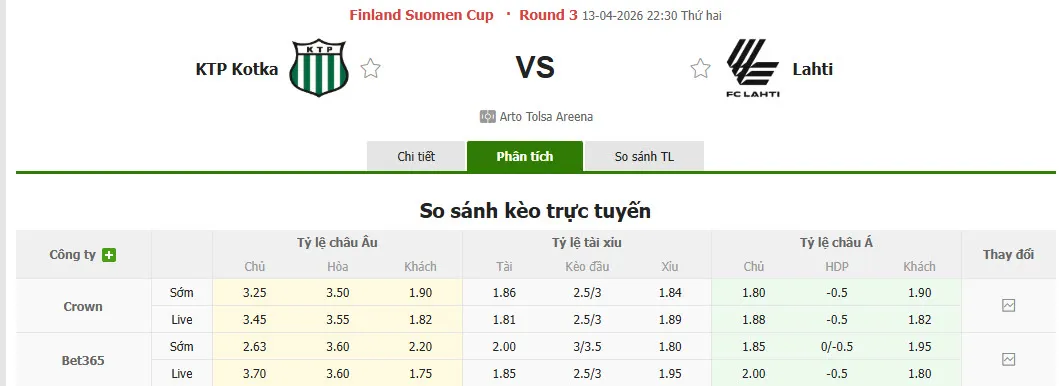 Phân tích và dự đoán soi kèo trận KTP đối đầu Lahti, diễn ra vào lúc 22h30 ngày 13/4 trong khuôn khổ cúp Quốc gia Phần Lan. Các chuyên gia hàng đầu sẽ đánh giá tỷ lệ kèo, dự đoán kết quả từ góc độ châu Âu và châu Á.