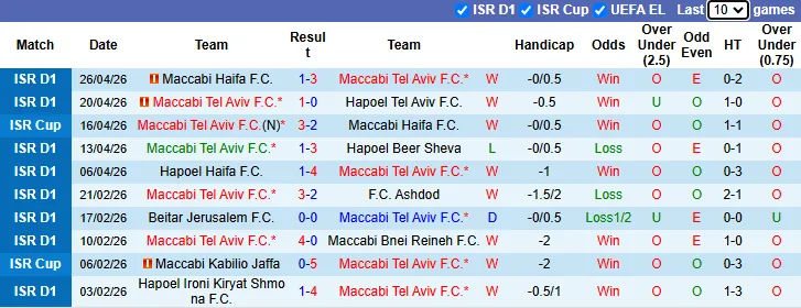 Thống kê phong độ 10 trận gần nhất của Maccabi Tel Aviv