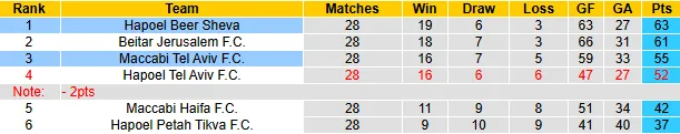 Ở phía đối diện, Hapoel Beer Sheva đang dẫn đầu bảng với 63 điểm. Đội khách duy trì phong độ ấn tượng với chuỗi 11 trận bất bại liên tiếp, trong đó có 4 trận thắng trên sân khách gần nhất. Lối chơi của Beer Sheva rất cân bằng giữa tấn công và phòng ngự: Hàng công đã ghi tới 63 bàn (hiệu suất 2.2 bàn/trận) trong khi hàng thủ mới chỉ để lọt lưới 27 bàn từ đầu mùa giải.