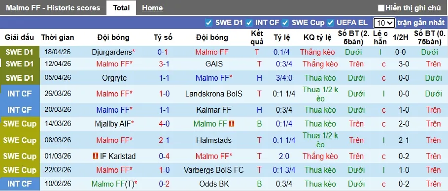 Thống kê phong độ 10 trận đấu gần nhất của Malmo.