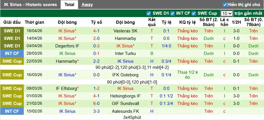 Thống kê phong độ 10 trận đấu gần nhất của IK Sirius.