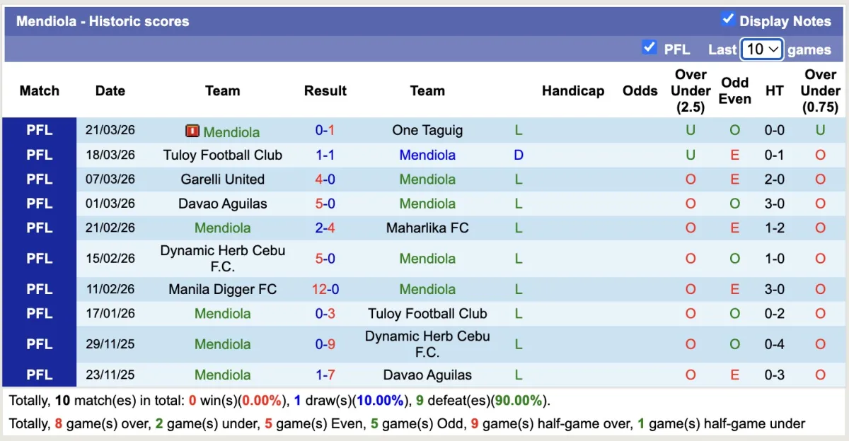 4 lần chạm trán gần nhất giữa Mendiola và Stallion Laguna đều ghi nhận nhiều bàn thắng và có cùng một kịch bản là đội chủ nhà thường xuyên phải chịu thua từ 5 đến 8 bàn. Nhiều khả năng trận đấu này sẽ chứng kiến đội khách có một màn trình diễn bùng nổ.