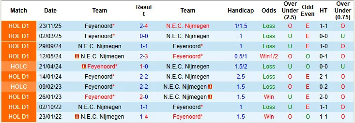 N.E.C. Nijmegen đã thắng kèo cả 3 trận gần đây gặp Feyenoord. Họ cũng thắng kèo đến 4 trong số 5 trận gần nhất tại giải VĐQG Hà Lan. Trong khi đó, Feyenoord lại để thua kèo cả 7 trận vừa qua tại giải VĐQG Hà Lan.