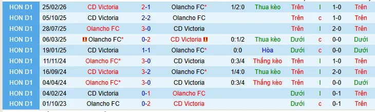 Lịch sử đối đầu giữa Olancho và Victoria.