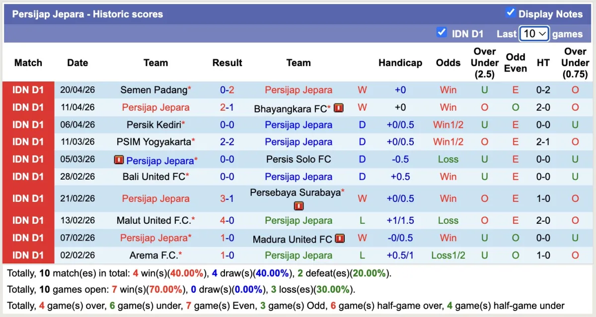 – Thống kê phong độ 10 trận đấu gần nhất của Persijap Jepara