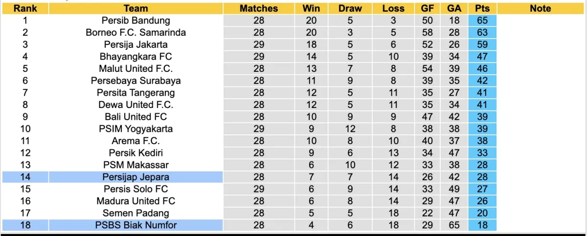 Tuy nhiên, tại mùa giải năm nay, PSBS Biak Numfor không thể duy trì phong độ của mình. Sau 28 vòng đấu, đội bóng này chỉ có được 4 chiến thắng và phải nhận 18 thất bại. Với 18 điểm hiện tại, đội khách đang đứng cuối bảng.