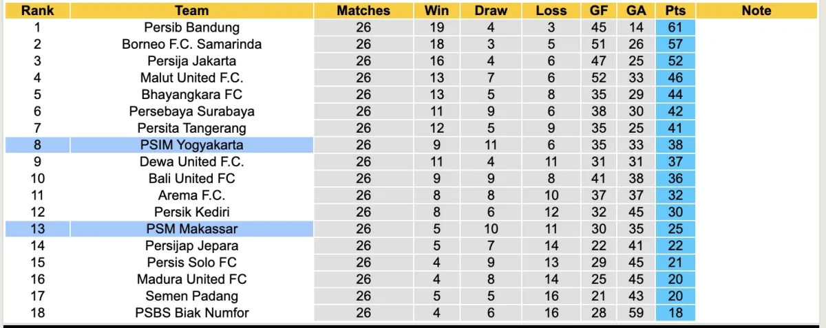 Dù mới lên hạng, PSIM Yogyakarta đang chứng tỏ mình là một đội bóng không dễ bị đánh bại. Sau 26 vòng đấu, đội bóng này chỉ phải nhận 6 thất bại, có 11 trận hòa và 9 chiến thắng. Với 38 điểm, họ hiện đứng thứ 8 trên bảng xếp hạng.