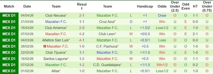 Mazatlan lại có phong độ trái ngược. Trong 10 trận gần nhất, họ giành được 3 chiến thắng, 2 trận hòa và thua tới 5 trận. Những chuyến làm khách càng làm nổi bật vấn đề khi Mazatlan không giành được chiến thắng nào trong 5 chuyến xa nhà gần nhất và để thua tới 4 lần.