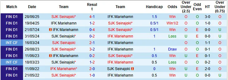 SJK Seinajoki chỉ thắng kèo 1 lần trong 3 trận tiếp đón IFK Mariehamn trên sân nhà tại giải VĐQG Phần Lan gần đây. Họ cũng đã trải qua chuỗi 6 trận liên tiếp không thắng kèo ở mọi giải đấu chính thức. Ngược lại, IFK Mariehamn đã thắng kèo tới 9 trong 12 trận đấu gần nhất có kèo chấp.