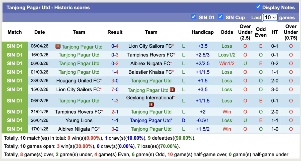– Thống kê phong độ 10 trận đấu gần nhất của Tanjong Pagar Utd