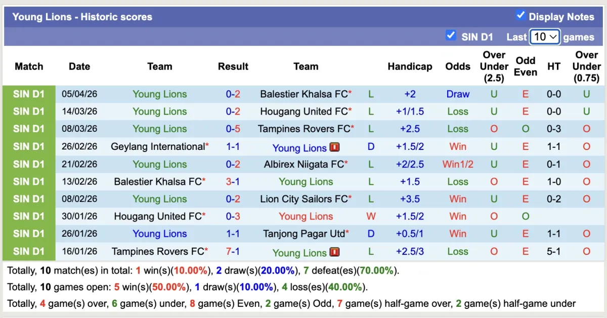 – Thống kê phong độ 10 trận đấu gần nhất của Young Lions