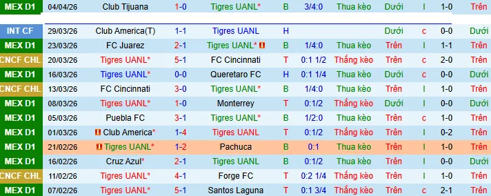 + Tigres UANL có thành tích thắng 3 và thua 7 trong 10 trận gần nhất theo kèo châu Á.