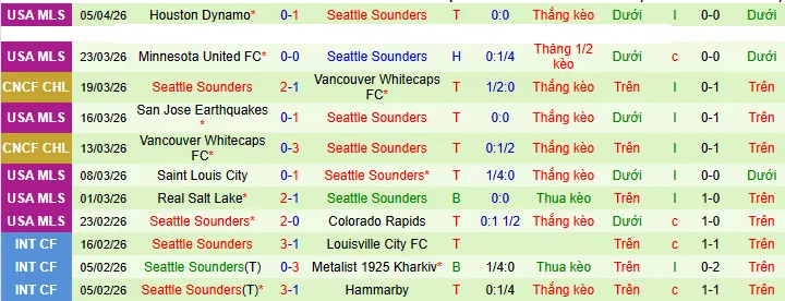 + Seattle Sounders thắng 8, thua 7 và hòa 5 trong 20 trận sân khách gần đây trên các mặt trận.