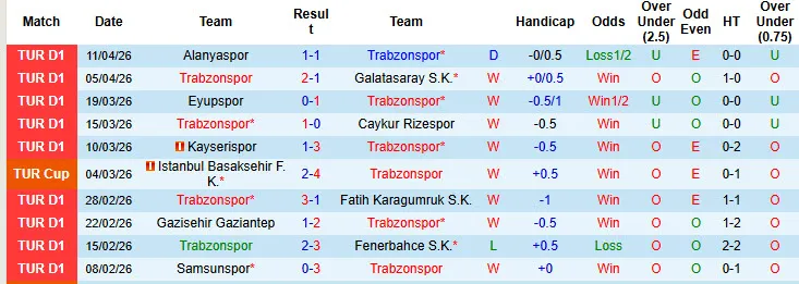 Thống kê phong độ 10 trận đấu gần nhất của Trabzonspor