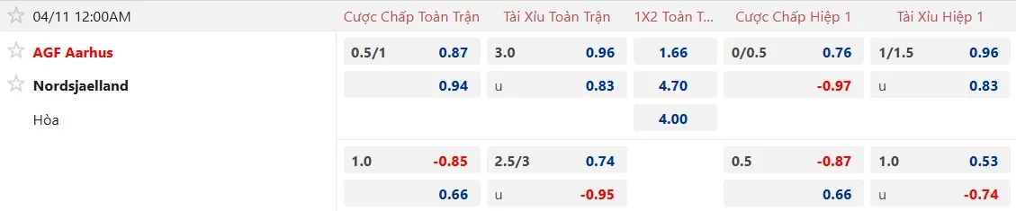 Trên sàn giao dịch châu Á, tỷ lệ kèo được ghi nhận là Aarhus chấp 3/4 trái, đây là mức kèo đã xuất hiện trong trận đối đầu gần nhất giữa hai đội vào tháng 10/2025, khi Aarhus có lợi thế sân nhà và đã đánh bại Nordsjaelland với tỷ số tối thiểu. Tuy nhiên, phong độ gần đây của Aarhus có dấu hiệu chững lại khi họ đã thua kèo châu Á trong 3/5 trận gần nhất, vì vậy có thể gặp khó khăn trước Nordsjaelland, đội bóng đang toàn thắng kèo châu Á trong cả 3 trận gần đây.