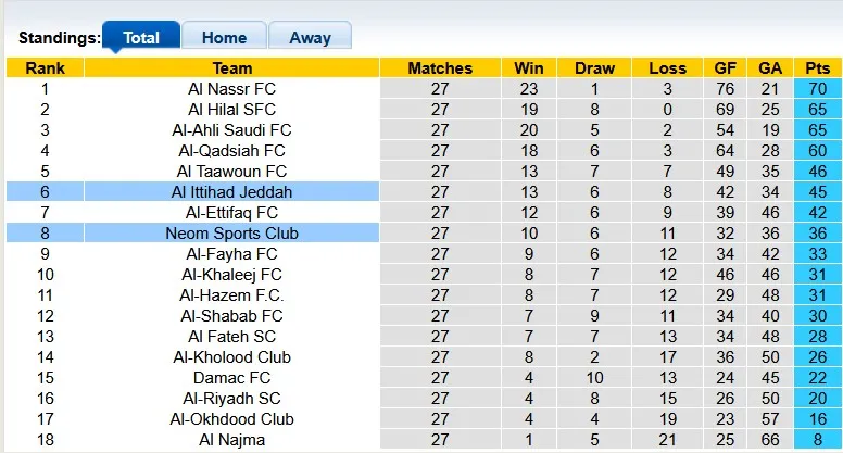 Neom là một tân binh tại giải VĐQG Saudi Arabia trong mùa giải này và họ đã thể hiện rất tốt. Trong bối cảnh hiện tại, khi đã chính thức trụ hạng thành công, đội khách sẽ thi đấu với tâm lý thoải mái và có thể gây ra bất ngờ trong vòng đấu này.
