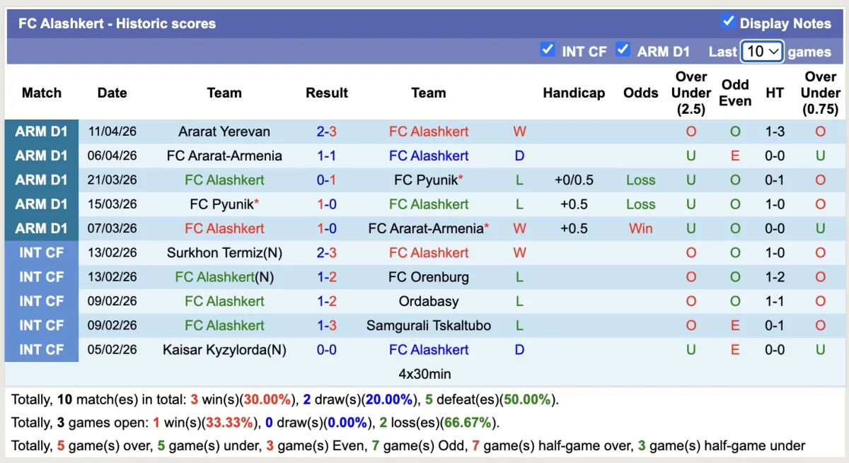 – Thống kê phong độ 10 trận đấu gần nhất của Alashkert