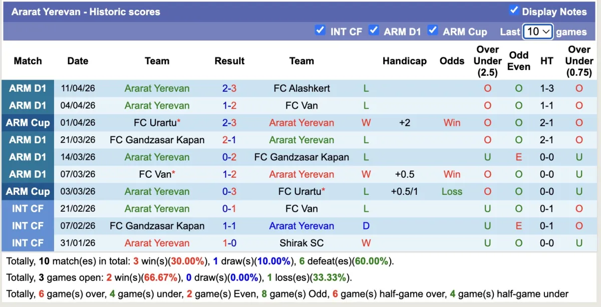 – Thống kê phong độ 10 trận đấu gần nhất của Ararat Yerevan