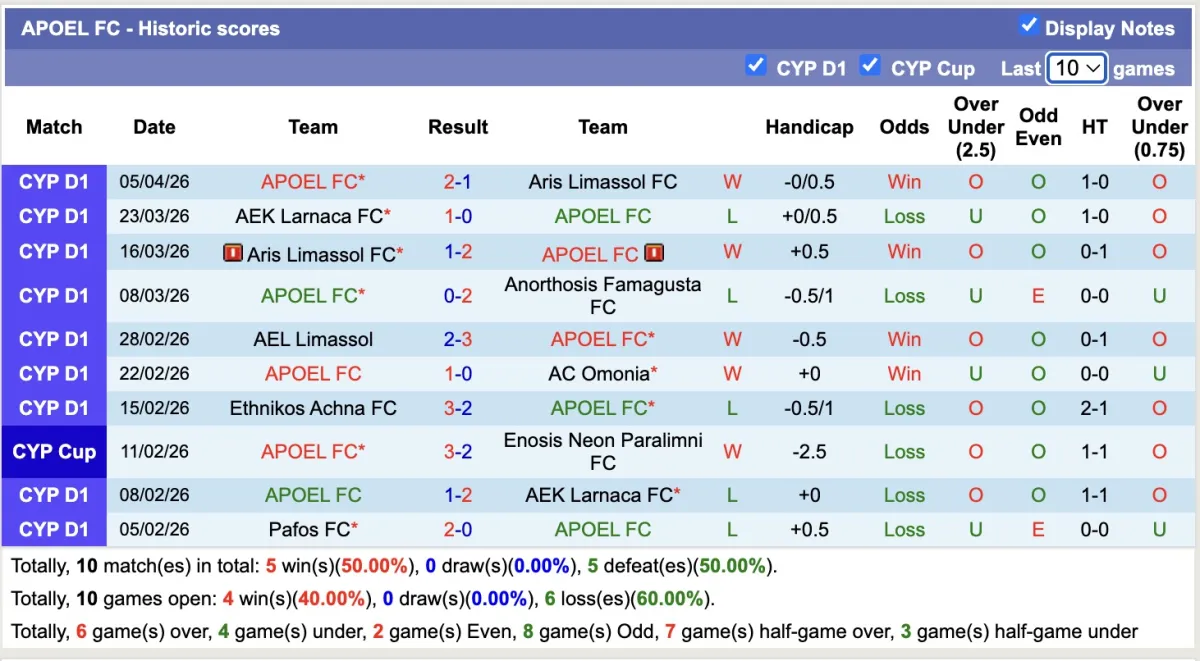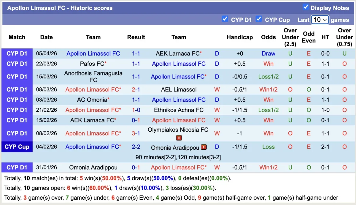 – Thống kê phong độ 10 trận đấu gần nhất của Apollon Limassol
