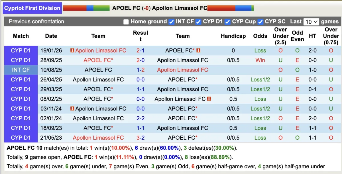 Trong lịch sử đối đầu giữa hai đội, những lần mà các nhà đầu tư đặt niềm tin vào APOEL từ năm 2023 đến nay thường dẫn đến thất vọng. Cụ thể, trong 10 cuộc chạm trán tại giải VĐQG, đội chủ nhà chỉ có 1 lần thắng kèo và đã thua kèo đến 9 lần.