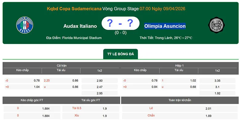 SOI KÈO, DỰ ĐOÁN TỶ LỆ BÓNG ĐÁ AUDAX ITALIANO VS OLIMPIA ASUNCION