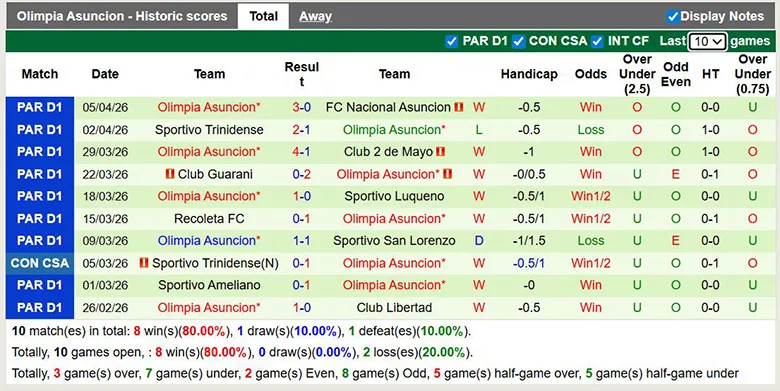 – Thống kê phong độ 10 trận đấu gần nhất của Olimpia Asuncion