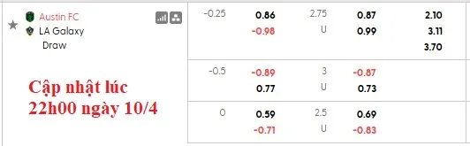Austin được đánh giá nhỉnh hơn một chút trong trận đấu này với kèo châu Á 1/4. Dù mức chấp không cao, nhưng vẫn có lý do để tin tưởng vào đội chủ nhà, những người đã thắng kèo châu Á 3/6 trận từ đầu mùa, trong khi Galaxy chỉ có 1 trận.