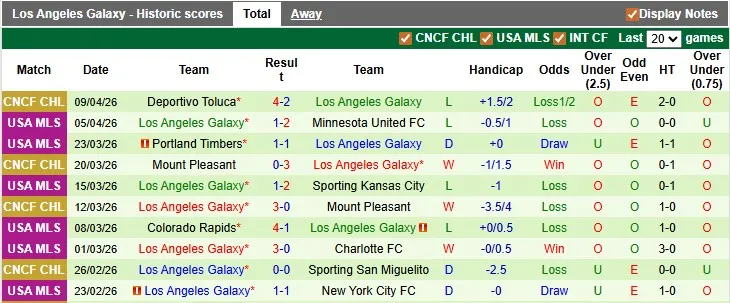 Thống kê phong độ 10 trận đấu gần nhất của L.A. Galaxy