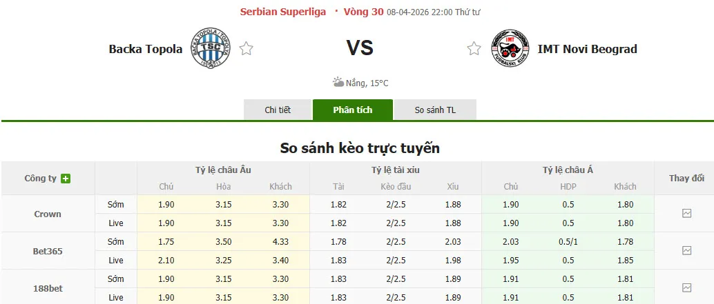 Backa Topola đã để thua kèo cả 2 lần gần đây khi tiếp đón IMT Belgrad trên sân nhà với mức cược chấp châu Á. Họ cũng đã thua kèo tới 5/6 trận đấu gần nhất tại giải VĐQG. Ngược lại, IMT Belgrad vừa thắng kèo tới 6 trong số 8 trận đấu gần đây của họ.
