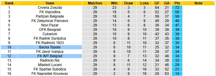 Trận đấu giữa Backa Topola và IMT Belgrad là một cuộc chiến khá cân sức trong lượt trận cuối cùng của giai đoạn đầu giải VĐQG Serbia 2025/26. Cả hai đội đều có 34 điểm sau 29 trận và đang đứng ở vị trí 10 và 12 trên bảng xếp hạng. Hiện tại, cả Backa Topola và IMT Belgrad đều đã chắc chắn góp mặt ở vòng bảng trụ hạng khi giải đấu bước vào giai đoạn 2. Trong cuộc đối đầu này, mặc dù Backa Topola được đánh giá cao hơn nhờ lợi thế sân nhà, nhưng người hâm mộ vẫn có lý do để lo lắng về khả năng đội bóng yêu thích của họ giành trọn 3 điểm.
