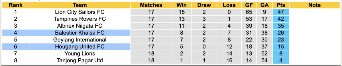 Nhìn xa hơn, trong 6 vòng đấu gần nhất, Hougang United chỉ có 1 chiến thắng và phải nhận tới 5 thất bại. Tính đến thời điểm này, sau 17 lượt trận, đội bóng này mới chỉ giành được 5 chiến thắng và đã thua 12 trận. Với 15 điểm, họ đang đứng ở vị trí thứ 6 trên bảng xếp hạng.