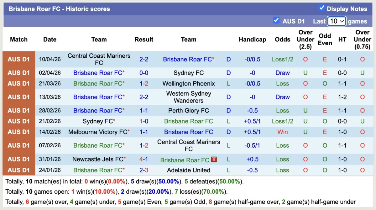 -Thống kê phong độ 10 trận đấu gần nhất của Brisbane Roar