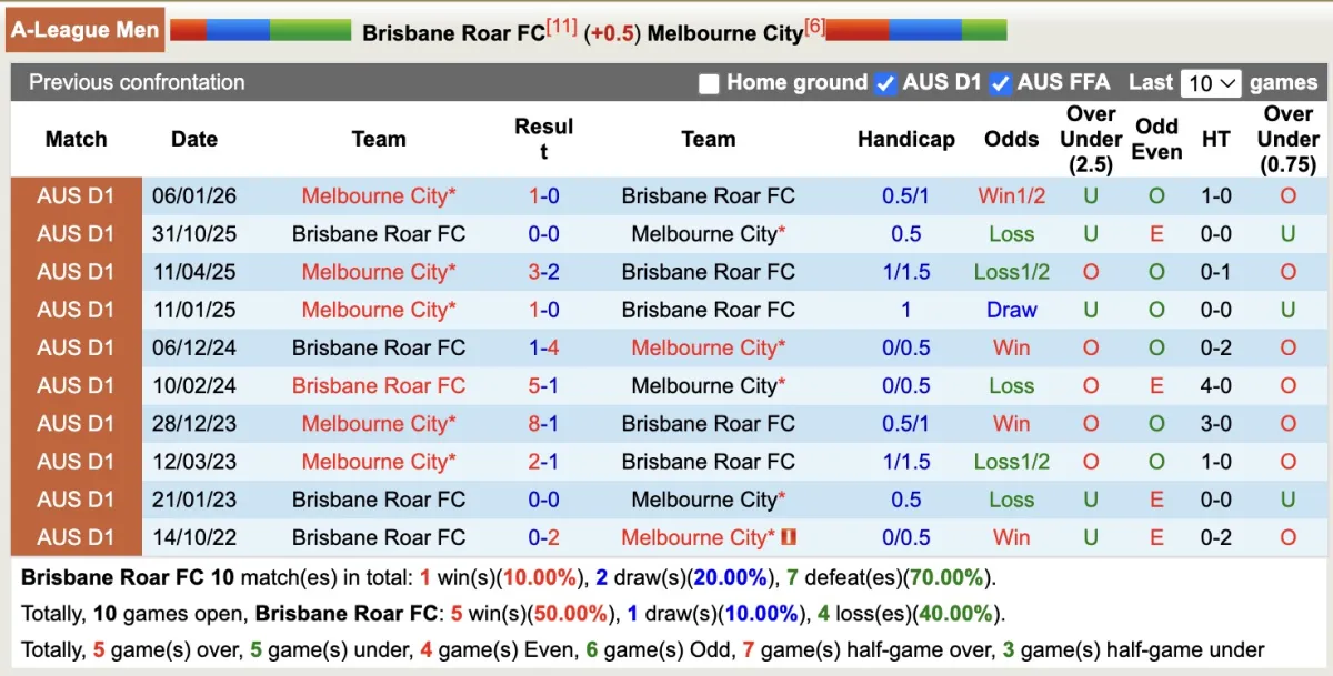 Lịch sử đối đầu giữa hai đội bóng đang nghiêng về phía Melbourne City khi trong 10 lần gặp gỡ gần đây, từ giữa tháng 10 năm 2022 cho đến nay, Brisbane Roar chỉ có 1 chiến thắng và phải nhận đến 7 thất bại.