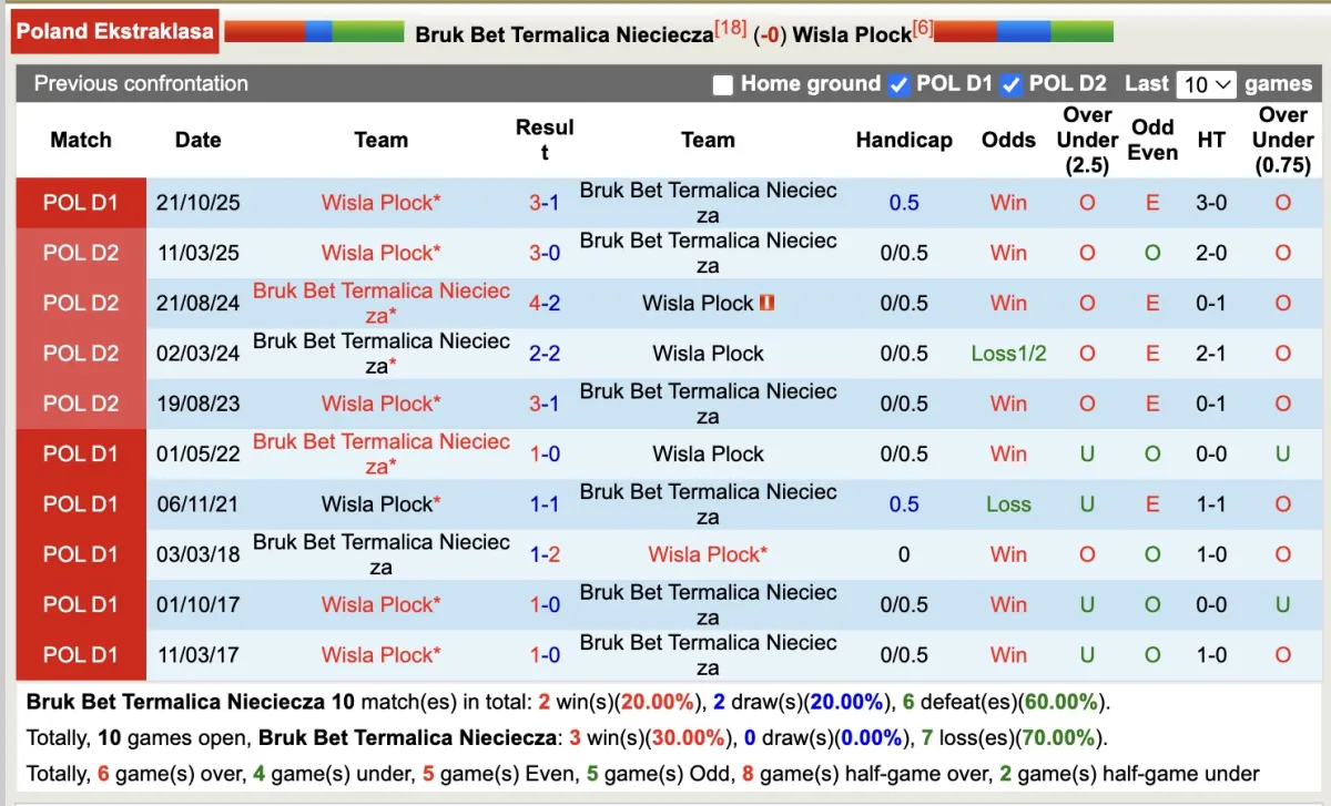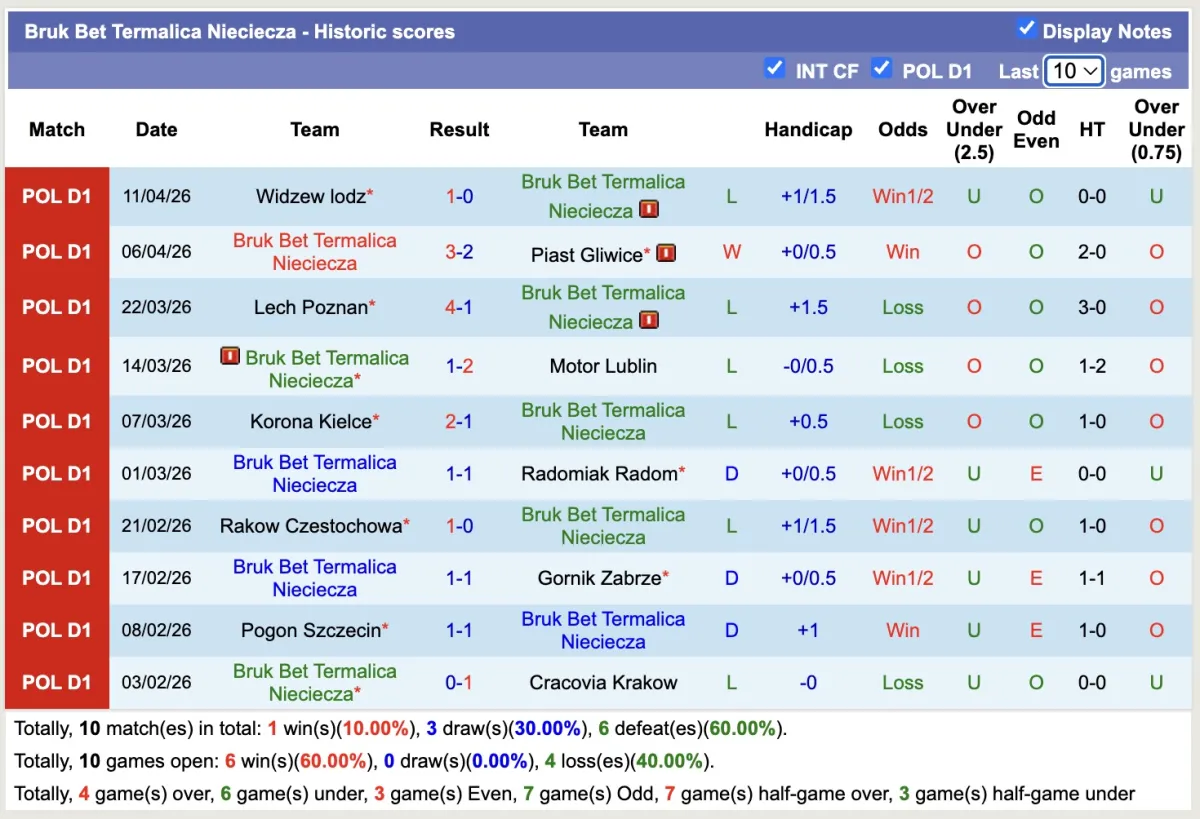 – Thống kê phong độ 10 trận đấu gần nhất của Bruk Bet Termalica Nieciecza
