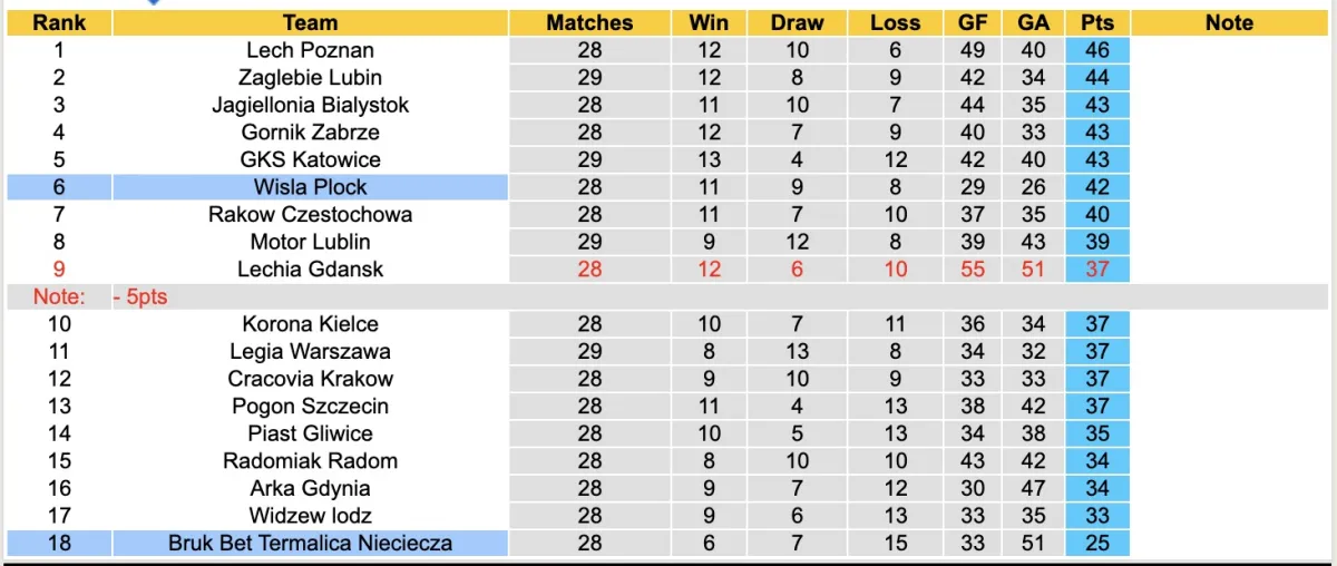 Tuy nhiên, niềm vui của fan hâm mộ Bruk Bet Termalica Nieciecza không kéo dài lâu khi sau 28 vòng đấu, đội bóng này chỉ có được 6 chiến thắng và phải nhận tới 15 thất bại. Hiện tại, đội chủ nhà đang đứng cuối bảng xếp hạng.