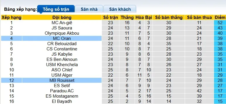 Thống kê phong độ, lịch sử đối đầu của MC Oran vs MB Rouisset