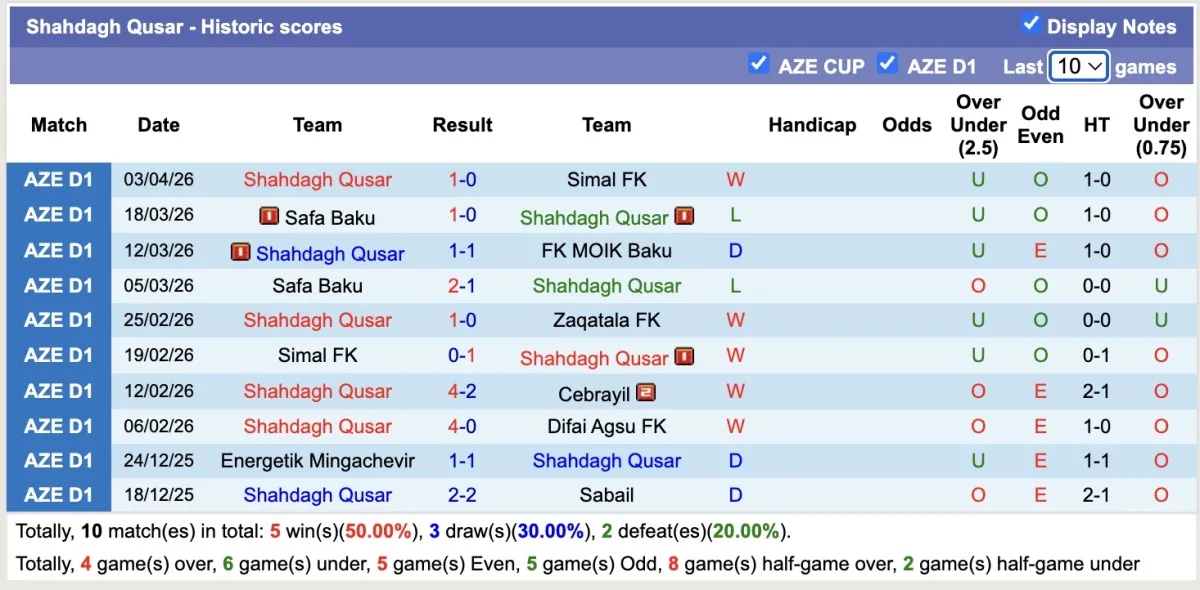 – Thống kê phong độ 10 trận đấu gần nhất của Shahdagh Qusar