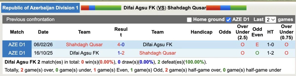 Thống kê phong độ, lịch sử đối đầu của Difai Agsu với Shahdagh Qusar