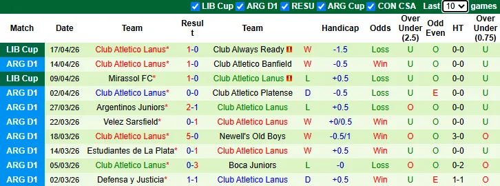 Thống kê phong độ 10 trận gần nhất của Lanus