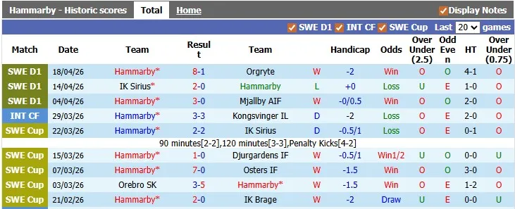 Mức kèo chấp châu Á dành cho Hammarby trong trận đấu này rất cao, lên tới 2 hòa, điều này cho thấy đội chủ nhà hoàn toàn được giới đầu tư tin tưởng. Họ cũng đã thắng kèo 2 trong 3 trận đấu gần đây nhất (tất cả đều là các trận sân nhà).
