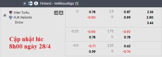 Trong 4 trận đầu mùa, Inter Turku đã thắng 2 trận theo kèo châu Á, trong khi đội khách HJK có đến 3 trận thắng kèo. Dù có lợi thế sân nhà và phong độ tốt nhưng kèo chỉ là 0:0, cho thấy sự thiếu tin cậy. HJK cũng đã thắng kèo 6/10 lần đối đầu gần đây (thua 3 trận).