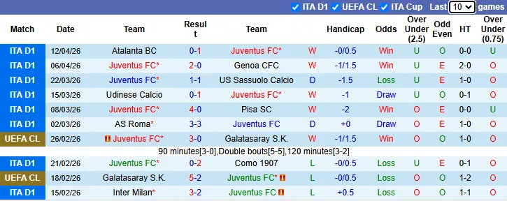 Thống kê phong độ 10 trận gần nhất của Juventus