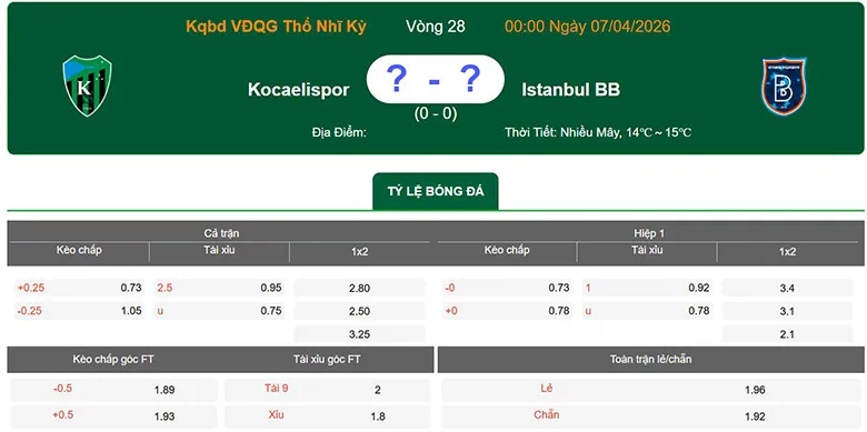 SOI KÈO, DỰ ĐOÁN TỶ LỆ BÓNG ĐÁ KOCAELISPOR VS ISTANBUL BASAKSEHIR