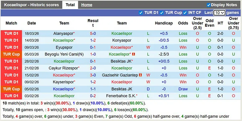 – Thống kê phong độ 10 trận đấu gần đây của Kocaelispor.