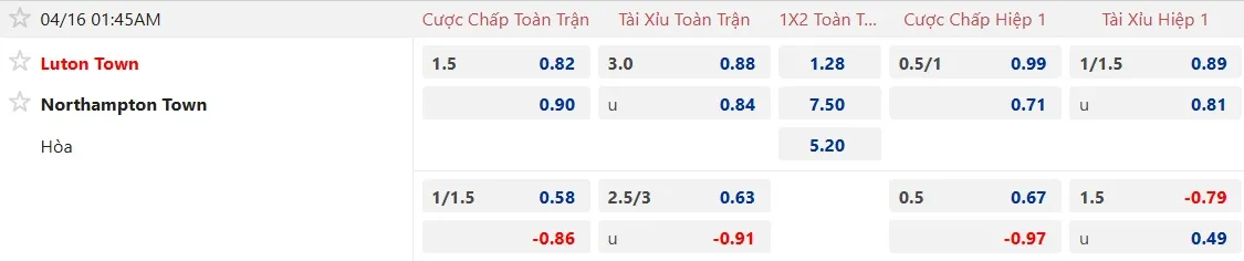 Trên sàn giao dịch châu Á, kèo Luton Town chấp 1 1/2 trái được ghi nhận là cao nhất trong lịch sử đối đầu giữa hai đội. Điều này cho thấy các nhà đầu tư đang đặt niềm tin lớn vào đội chủ nhà, những người đã thắng kèo 5 lần và hòa 2 trong 7 trận gần đây. Về phía Northampton, đội khách đã thua kèo châu Á 8 lần, hòa 1 và chỉ thắng 2 ở 11 trận gần nhất.