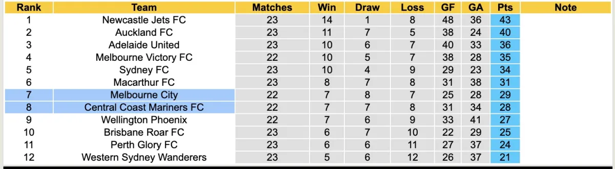 Trong 3 vòng đấu gần đây, Melbourne City vẫn giữ được thành tích bất bại với 2 chiến thắng. Sau 22 trận đấu ở mùa giải này, họ đã có 29 điểm và hiện đang đứng ở vị trí thứ 7 trên bảng xếp hạng. Tuy nhiên, Central Coast Mariners không phải là đối thủ dễ chơi.