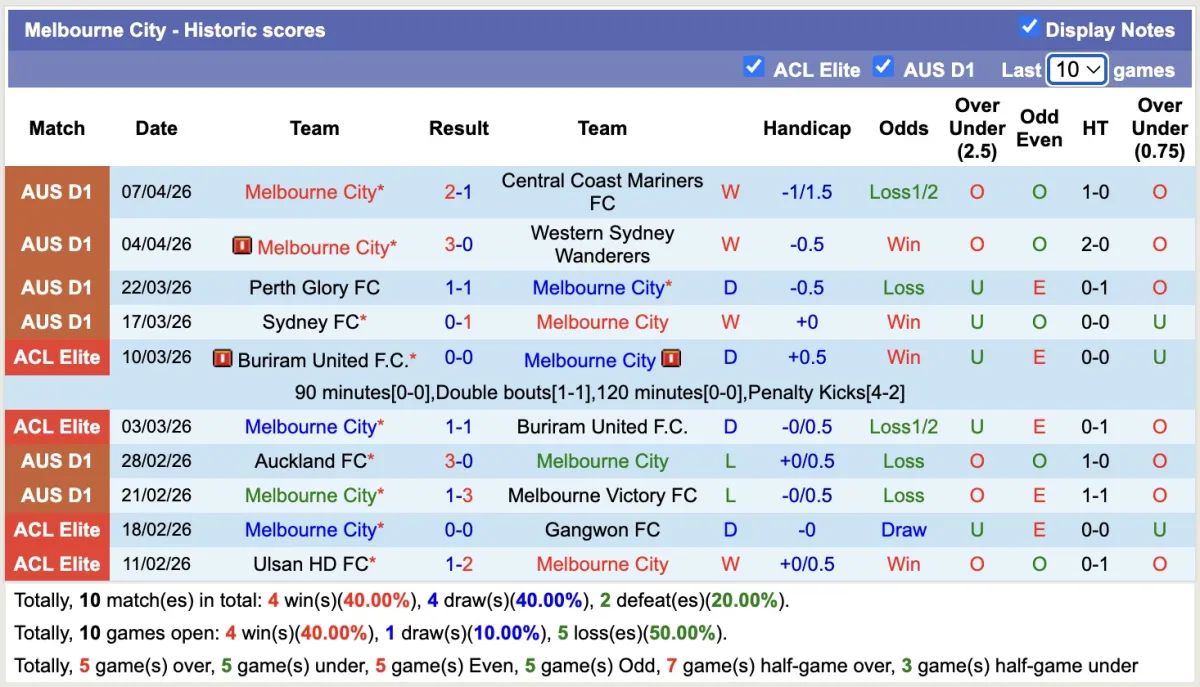 – Thống kê phong độ 10 trận đấu gần nhất của Melbourne City