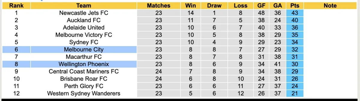 Tính đến thời điểm hiện tại, sau 23 vòng đấu tại giải VĐQG Úc, Wellington Phoenix mới chỉ có 8 chiến thắng, hòa 6 và để thua 9 lần. Với 30 điểm hiện có, đội khách đang đứng ở vị trí thứ 8 trên bảng xếp hạng.